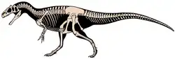 Allosaurus (/ˌæləˈsɔːrəs/ AL-o-SAWR-us)[1] is a genus of theropod dinosaur that lived 155 to 145 million years ago during the Late Jurassic period (Kimmeridgian to late Tithonian ages). The first fossil remains that could definitively be ascribed to this genus were described in 1877 by Othniel C. Marsh. The name "Allosaurus" means "different lizard", alluding to its lightweight vertebrae, which Marsh believed were unique. The genus has a very complicated taxonomy and includes at least three valid species, the best known of which is A. fragilis. The bulk of Allosaurus remains come from North America's Morrison Formation, with material also known from the Alcobaça, Bombarral, and Lourinhã formations in Portugal. It was known for over half of the 20th century as Antrodemus, but a study of the abundant remains from the Cleveland-Lloyd Dinosaur Quarry returned the name "Allosaurus" to prominence. As one of the first well-known theropod dinosaurs, it has long attracted attention outside of paleontological circles.