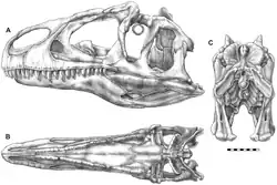 Illustrations showing the skull of A. jimmadseni from the side (A), top (B), and back (C)