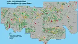 Map showing the thousands of dinosaur bones excavated at the Cleveland-Lloyd Dinosaur Quarry