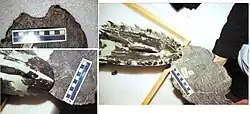 Allosaurus is known from at least three localities in Portugal, from rocks of the Lourinhã, Bombarral, and Alcobaça formations.[28] The first specimen (MNHNUL/AND.001), a partial skeleton that includes an articulated hind limb and pelvis, was found in 1988 near the village of Andrés in the District of Leiria during the construction of a warehouse.[29][30] Reported in 1999 and assigned to the species A. fragilis, it was the first Allosaurus specimen to be found outside of North America. A. fragilis became the first dinosaur species known from both Europe and North America, suggesting faunal exchange between the two continents.[28][29] This site has been worked on again between 2005 and 2010, resulting in the discovery of at least two more Allosaurus individuals, including many skull bones.[28] In 2005, a single maxilla was reported from the Guimarota coal mine, a locality well-known for its fossils of Mesozoic mammals; this fossil was assigned to Allosaurus but not to any particular species.[31]