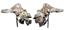 The lacrimal bones of Allosaurus extend above and in front of the eyes to form a pair of horns which varied in shape and size.[3] Leading into the horns, the skull also features a pair of ridges running along the top of the nasal bones.[3] The horns were probably covered in a keratin sheath and may have had a variety of functions, including acting as sunshades for the eyes,[3] being used for display, and being used in combat against other members of the same species (although they were fragile).[3][24][55] There was a ridge along the back of the skull roof for muscle attachment, as is also seen in tyrannosaurids.[24]