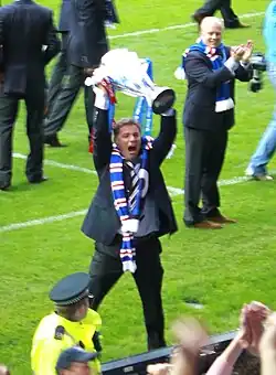 McCoist returned to Rangers as an assistant manager to Walter Smith in January 2007.[41] After Rangers' victory over Queen of the South in the 2008 Scottish Cup final, Smith revealed that McCoist had been in charge of the team for the entire cup campaign.[42] "Obviously, Walter had me in mind for the manager's position when he stepped down, and for a couple of the Scottish Cup runs he let me take the team. I'd do the preparation and the training, but obviously he'd be there. I'd do the team talk, all that kind of stuff."[9]