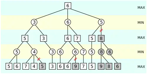 An illustration of alpha–beta pruning. The grayed-out subtrees don't need to be explored (when moves are evaluated from left to right), since it is known that the group of subtrees as a whole yields the value of an equivalent subtree or worse, and as such cannot influence the final result. The max and min levels represent the turn of the player and the adversary, respectively.