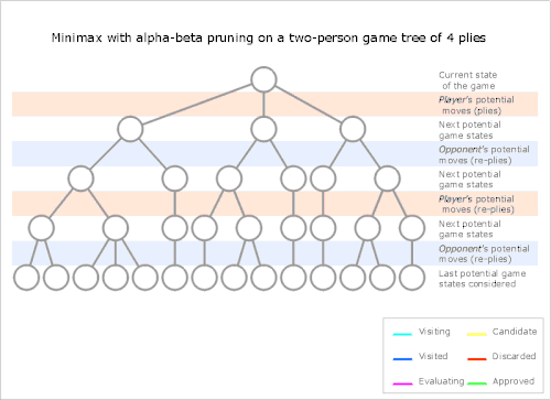 Alpha–beta pruning is a search algorithm that seeks to decrease the number of nodes that are evaluated by the minimax algorithm in its search tree. It is an adversarial search algorithm used commonly for machine playing of two-player combinatorial games (Tic-tac-toe, Chess, Connect 4, etc.). It stops evaluating a move when at least one possibility has been found that proves the move to be worse than a previously examined move. Such moves need not be evaluated further. When applied to a standard minimax tree, it returns the same move as minimax would, but prunes away branches that cannot possibly influence the final decision.[1]