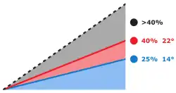 In the United States and Canada, there are four rating symbols: Easy (green circle), Intermediate (blue square), and Difficult (black diamond), and Experts Only (double black diamond) Ski trail difficulty is measured by percent slope, not degree angle. A 100% slope is a 45-degree angle. In general, beginner slopes (green circle) are between 6% and 25%. Intermediate slopes (blue square) are between 25% and 40%. Difficult slopes (black diamond) are 40% and up. Although slope gradient is the primary consideration in assigning a trail difficulty rating, other factors come into play. A trail will be rated by its most difficult part, even if the rest of the trail is easy. Ski resorts assign ratings to their own trails, rating a trail compared only with other trails at that resort. Also considered are width of the trail, sharpest turns, terrain roughness, and whether the resort regularly grooms the trail.