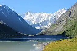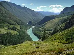 The source of the black Biya River is Lake Teletskoye, the region's largest lake located in an isolated area far south in the mountains. The emerald-colored Katun River has its source at the Gebler glacier, which is situated on the Republic's highest point, Mount Belukha. The Katun River, in particular, holds a religious significance for native Altaians, as well as for many Russians who live in the area, as Mount Belukha is known in Altai folklore to be the gateway to the mystical kingdom of Shambhala.[14]