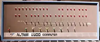 The Altair 8800 is a microcomputer introduced in 1974 by Micro Instrumentation and Telemetry Systems (MITS) based on the Intel 8080 CPU.[2] It was the first commercially successful personal computer.[3] Interest in the Altair 8800 grew quickly after it was featured on the cover of the January 1975 issue of Popular Electronics.[4] It was sold by mail order through advertisements in Popular Electronics, Radio-Electronics, and in other hobbyist magazines.[5][6] The Altair 8800 had no built-in screen or video output, so it would have to be connected to a serial terminal or teletype to have any output. To connect it to a terminal, a serial interface card had to be installed. Alternatively, the Altair could be programmed using its front-panel switches.