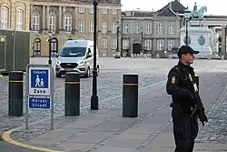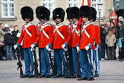 Amalienborg is guarded day and night by Royal Life Guards (Den Kongelige Livgarde). Their full dress uniform is fairly similar to that of the Foot Guards regiments of the British Army: a scarlet tunic, blue trousers, and a navy bearskin cap. The guard march from Rosenborg Castle at 11.30 am daily through the streets of Copenhagen and execute the changing of the guard in front of Amalienborg at noon. In addition, post replacement is conducted every two hours.[5]
