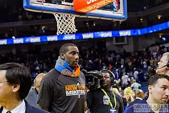 On June 30, 2010, Stoudemire opted out of his contract with the Phoenix Suns, which made him an unrestricted free agent. On July 5, 2010, Stoudemire and the New York Knicks agreed in principle to a contract estimated to be worth around $99.7 million over five years.[34] On the first day that free agents were allowed to officially sign, the Knicks formally introduced Stoudemire at Madison Square Garden. There Stoudemire proclaimed "the Knicks are back!" referring to the team's lack of success the past few years.[35] With the Knicks, Stoudemire was reunited with head coach Mike D'Antoni, who had coached him with the Suns. On December 15, 2010, in a loss against the Boston Celtics, Stoudemire set a franchise record with his ninth straight 30-point game.[36] On December 17, 2010, Stoudemire set a franchise record with his ninth straight game shooting 50 percent or better from the field.[37] On January 27, 2011, Stoudemire was named a starter on the Eastern Conference All-Star Team alongside LeBron James, Dwyane Wade, Derrick Rose, and Dwight Howard. He became the first Knicks player to start in the game since Patrick Ewing. In the game Stoudemire scored 29 points, which tied him with LeBron James for most on the Eastern Conference team. On February 22, 2011, the Knicks made a three-team trade with the Denver Nuggets and Minnesota Timberwolves that sent Nuggets superstar Carmelo Anthony to the Knicks along with the Nuggets' starting point guard Chauncey Billups.[38] In 2011, the Knicks made the playoffs for the first time since 2004. Stoudemire was injured during the playoffs. In game 3, Stoudemire attempted a Willis Reed-like comeback by playing in the game despite a bad back.[39] In the first round of the playoffs, the Knicks were swept by the Boston Celtics.[40] Stoudemire ended up having one of the best seasons in his career, averaging 25.3 points, 9.1 rebounds, a career-high 2.6 assists and 2 blocks per game. Stoudemire developed a mid-range game and shot a career-high 43% from three-point range. Stoudemire was named to the All-NBA Second Team.