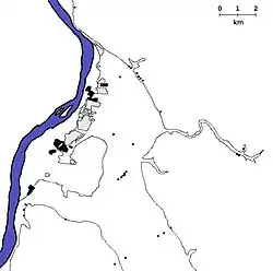 The site is on the east bank of the Nile River, in what today is the Egyptian province of Minya. It is about 58 km (36 mi) south of the city of al-Minya, 312 km (194 mi) south of the Egyptian capital, Cairo, and 402 km (250 mi) north of Luxor (site of the previous capital, Thebes).[2] The city of Deir Mawas lies directly to its west. On the east side of Amarna there are several modern villages, the chief of which are l-Till in the north and el-Hagg Qandil in the south.