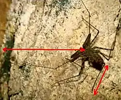Amblypygids range from 5 to 16 centimeters (2.0 to 6.3 in) in legspan.[6][7] Most species have eight eyes; a pair of median eyes at the front of the carapace above the chelicerae and 2 smaller clusters of three eyes each further back on each side.