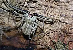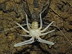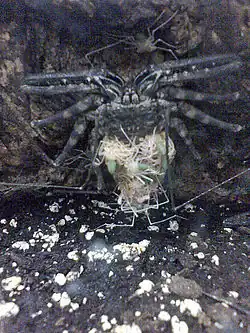 The amblypygid diet mostly consists of arthropod prey, but these opportunistic predators have also been observed feeding on vertebrates.[6] Amblypygids generally do not feed for a period of time before, during, and after molting. Like other arachnids, an amblypygid will molt several times during its life.[6] Molting is done while hanging from the underside of a horizontal surface in order to use gravity to assist in separating the old exoskeleton from the animal.