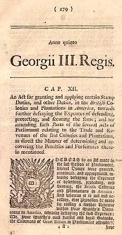 The Parliament at Westminster saw itself as the supreme lawmaking authority throughout the Empire and thus entitled to enact any legislation, including levying any tax, without colonial approval or even consultation.[41] They argued that the colonies were legally British corporations subordinate to the British Parliament.[42] Parliament insisted that the colonists effectively enjoyed a "virtual representation", as most British people did, since only a small minority of the British population were eligible to elect representatives to Parliament.[43] However, Americans such as James Otis maintained that there was no one in Parliament responsible specifically to any colonial constituency, so they were not "virtually represented" by anyone in Parliament.[44]