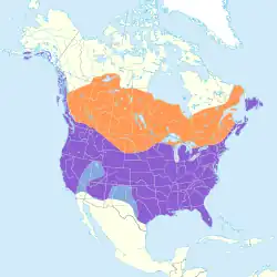 The American crow has a large range, extending from the Pacific Ocean to the Atlantic Ocean in Canada, on the French islands of Saint-Pierre and Miquelon, south through the United States, and into northern Mexico.[1] They have also been recorded in Bermuda from 1876 onwards.[34] The increase in trees throughout the Great Plains during the past century due to fire suppression and tree planting facilitated range expansions of the American crow[35] as well as range expansions of many other species of birds.[36][37][38] Virtually all types of country – from wilderness, farmland, parks, and open woodland to towns and major cities – and is absent only from tundra habitat.[39][40] The American crow is a permanent resident in most of the US, but most Canadian birds migrate some distance southward in winter.[39] Outside the nesting season, these birds often gather in large communal roosts of thousands or even millions of crows at night.[41][42]