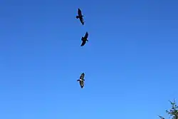 If seen flying at a distance from where size estimates are unreliable, the distinctly larger common ravens (C. corax) can be distinguished by their almost lozenge-shaped tail and their larger-looking heads.[21][22] They also fluff their throat feathers when calling, similarly to fish crows.[23] Ravens also soar for extended periods, unlike crows, which rarely fly more than a few seconds without flapping their wings.[24][25]