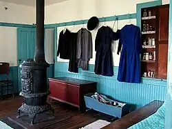 Amish church membership begins with adult baptism, usually between the ages of 16 and 23. Church districts have between 20 and 40 families, and Old Order Amish and New Order Amish worship services are held every other Sunday in a member's home or barn, while the Beachy Amish worship every Sunday in churches.[16] The rules of the church, the Ordnung, which differs to some extent between different districts, are reviewed twice a year by all members of the church. The Ordnung must be observed by every member and covers many aspects of Old Order Amish day-to-day living, including prohibitions or limitations on the use of power-line electricity, telephones, and automobiles, as well as regulations on clothing. Generally, a heavy emphasis is placed on church and family relationships. The Old Order Amish typically operate their own one-room schools and discontinue formal education after grade eight (age 13–14). Most Amish do not buy commercial insurance or participate in Social Security. As present-day Anabaptists, Amish church members practice nonresistance and will not perform any type of military service.[17]