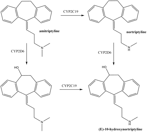 - ^ a b c d Hicks JK, Swen JJ, Thorn CF, Sangkuhl K, Kharasch ED, Ellingrod VL, et al. (May 2013). "Clinical Pharmacogenetics Implementation Consortium guideline for CYP2D6 and CYP2C19 genotypes and dosing of tricyclic antidepressants". Clinical Pharmacology and Therapeutics. 93 (5): 402–408. doi:10.1038/clpt.2013.2. PMC 3689226. PMID 23486447.
