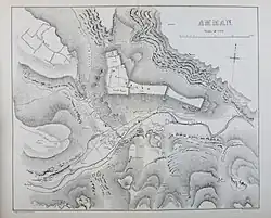 Amman began to be resettled in 1878, when several hundred Muslim Circassians arrived following their expulsion from the North Caucasus by the Russian Empire during the events of the Russo-Circassian War.[11] Between 1878 and 1910, tens of thousands of Circassians became refugees in the Ottoman Empire, which had moved large numbers of them into its province of Syria.[56] The Ottoman authorities directed the Circassians, who were mainly of peasant stock, to settle in Amman, and distributed arable land among them. Their settlement was a partial manifestation of the Ottoman statesman Kamil Pasha's project, which did not materialize, to establish the Amman Province (vilayet) which, along with other sites in its vicinity, would become Circassian-populated townships guaranteeing the security of the Damascus–Medina highway.[57] The first Circassian settlers, who belonged to the Shapsug tribe,[58] lived near Amman's Roman theater and incorporated its stones into the houses they built.[11] The English traveller Laurence Oliphant noted in his 1879 visit that most of the original Circassian settlers had left Amman by then, with about 150 remaining.[58] They were joined by Circassians from the Kabardian and Abzakh tribes in 1880–1892.[58]