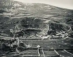 Until 1900 settlement was concentrated in the valley and slopes of the Amman stream and settlers built mud-brick houses with wooden roofs.[58] The French Dominican priest Marie-Joseph Lagrange commented in 1890 about Amman: "A mosque, the ancient bridges, all that jumbled with the houses of the Circassians gives Amman a remarkable physiognomy".[58] The new village became a nahiye (subdistrict) center of the kaza of al-Salt in the Karak Sanjak established in 1894.[58] By 1908 Amman contained 800 houses divided between three main quarters, Shapsug, Kabartai and Abzakh, each called after the Circassian groupings which respectively settled there, a number of mosques, open-air markets, shops, bakeries, mills, a textile factory, a post and telegraph office and a government compound (saraya).[58] Kurdish settlers formed their own quarter called "al-Akrad" after them, while a number of townspeople from nearby al-Salt and al-Fuheis, seeking to avoid high taxes and conscription or attracted by financial incentives, and traders from Najd and Morocco, had also moved to the town.[60]
