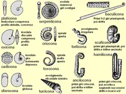 - Planorbicone – Intermediate between serpenticones and spherocones: Moderately broad, evolute to involute. Wider and more involute ammonoids on the serpenticone-spherocone spectrum are termed Cadicones.