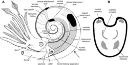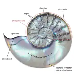 The siphuncle in most ammonoids is a narrow tubular structure that runs along the shell's outer rim, known as the venter, connecting the chambers of the phragmocone to the body or living chamber. This distinguishes them from living nautiloides (Nautilus and Allonautilus) and typical Nautilida, in which the siphuncle runs through the center of each chamber.[20] However the very earliest nautiloids from the Late Cambrian and Ordovician typically had ventral siphuncles like ammonites, although often proportionally larger and more internally structured.[21] The word "siphuncle" comes from the Neo-Latin siphunculus, meaning "little siphon".[22]