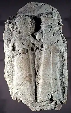 There are also sparse mentions about Amorites (often as MAR-DUki) in tablets from the East Semitic-speaking kingdom of Ebla, dating from 2500 BC to the destruction of the city in c. 2250 BC.[8] From the perspective of the Eblaites, the Amorites were a rural group living in the narrow basin of the middle and upper Euphrates in northern Syria.[9] The Eblaites used the term MAR.TU in an early time for a state and people east to Ebla (around Emar and Tuttul), which means the name Amurru for the west is later than the name for the state or the people.[10]