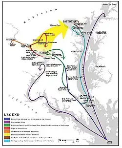 This was demonstrated during the American War of 1812, when the ships of the North America Station of the Royal Navy and military forces of the British Army, Board of Ordnance, and Royal Marines, maintained a blockade of much of the Atlantic seaboard of the United States of America, carried out amphibious raids such as the 22 June 1813 Battle of Craney Island,[15] and then launched the Chesapeake Campaign (defeating American forces in the Battle of Bladensburg, capturing and burning Washington, DC, and raiding Alexandria, Virginia),[16][17] from Bermuda.