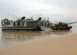 Amphibious warfare is a type of offensive military operation that today uses naval ships to project ground and air power onto a hostile or potentially hostile shore at a designated landing beach.[1] Through history the operations were conducted using ship's boats as the primary method of delivering troops to shore. Since the Gallipoli Campaign, specialised watercraft were increasingly designed for landing troops, material, and vehicles, including by landing craft and for insertion of commandos, by fast patrol boats, zodiacs (rigid inflatable boats) and from mini-submersibles. The term amphibious first emerged in the United Kingdom and the United States during the 1930s with introduction of vehicles such as Vickers-Carden-Loyd Light Amphibious Tank or the Landing Vehicle Tracked.[note 1]