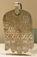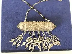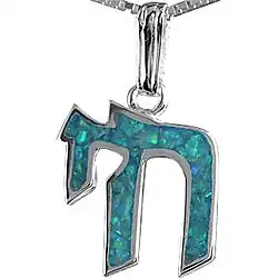 Amulets are plentiful in the Jewish tradition, with examples of Solomon-era amulets existing in many museums. Due to the proscription of idols and other graven images in Judaism, Jewish amulets emphasize text and names. The shape, material, and color of a Jewish amulet makes no difference. Examples of textual amulets include the Silver Scroll (c. 630 BCE), the Chai necklace (though this is also worn simply to indicate Jewish identity), and inscriptions of one of the names of the god of Judaism - such as ה (He), יה (YaH), or שדי (Shaddai) - on a piece of parchment or metal, usually silver.[27] Counter-examples, however, include the Hamsa (an outline of a human hand) and the Seal of Solomon.