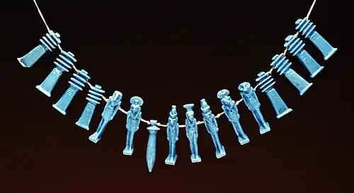 The most common material for such amulets was a kind of ceramic known as Egyptian faience or tjehenet, but amulets were also made of stone, metal, bone, wood and gold.[5]: 66 [8] Phylacteries containing texts were another common form of amulet.[9]