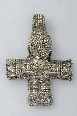 A pendant crucifix, considered in Christian tradition as a defense against demons, as the holy sign of Christ's victory over every evil