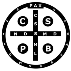 Back of the Saint Benedict medal with the Vade Retro Satana abbreviation, used in liturgical Western Christian traditions.