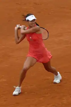 As a qualifier, Ivanovic won her first career singles title early in the year at the Canberra International, after defeating Melinda Czink in the final.[28] Her ranking continued to rise after wins over Svetlana Kuznetsova in Miami, Nadia Petrova also in Miami, and Vera Zvonareva in Warsaw, all of whom were top-10 players. Ivanovic lost to Amélie Mauresmo at the Australian Open in the third round, at Doha in the third round after holding a 6–2, 2–0 lead, and at the Miami Masters in the quarterfinals. However, Ivanovic's biggest win to date then came over Mauresmo in the third round of the French Open.[29] She advanced to the quarterfinals of only her second Grand Slam tournament by defeating Francesca Schiavone in the fourth round.[30] Later in the year, Ivanovic reached the semifinals of the Zurich Open and Generali Ladies Linz, losing to Patty Schnyder in both tournaments. She finished the year ranked No. 16.