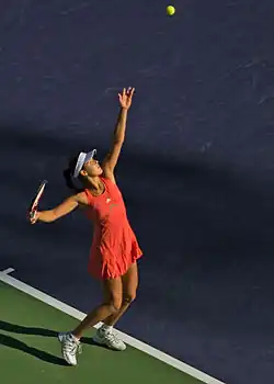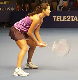 Ivanovic's breakthrough came at the 2004 Zurich Open, where she qualified and was narrowly beaten by Venus Williams in the second round in two tiebreak sets. By the age of 18, Ivanovic had already defeated established players such as Svetlana Kuznetsova, Nadia Petrova, Vera Zvonareva and Amélie Mauresmo. Ivanovic's struggles after winning the 2008 French Open were well documented.[11] After that victory, she was overwhelmed by attention,[12] and was unable to repeat her French Open success, failing to reach a major quarterfinal in her subsequent 17 appearances, and dropping as low as No. 65 in the rankings in July 2010.[13][14] In 2012, Ivanovic reached her first major quarterfinal since her French Open title at the 2012 US Open, thereby achieving the feat of reaching the quarterfinals at all four majors, and finished with a year-end top 15 ranking for the first time since 2008. In 2014, Ivanovic enjoyed a resurgence, beginning with her victory in the Auckland Open, her first singles title in over two years, before going on to win the Monterrey Open, Aegon Classic and the Pan Pacific Open. She qualified for competition in the WTA Tour Championships and secured a year-end ranking of No. 5, signifying her return to the world's elite.[15] In 2015, Ivanovic made it to the semifinals of a major for the first time in seven years at the French Open. In late December 2016, she announced her retirement, citing being no longer able to perform to a high standard as a major factor.[16]