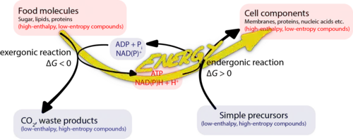 Anabolism is powered by catabolism, where large molecules are broken down into smaller parts and then used up in cellular respiration. Many anabolic processes are powered by the cleavage of adenosine triphosphate (ATP).[6] Anabolism usually involves reduction and decreases entropy, making it unfavorable without energy input.[7] The starting materials, called the precursor molecules, are joined using the chemical energy made available from hydrolyzing ATP, reducing the cofactors NAD+, NADP+, and FAD, or performing other favorable side reactions.[8] Occasionally it can also be driven by entropy without energy input, in cases like the formation of the phospholipid bilayer of a cell, where hydrophobic interactions aggregate the molecules.[9]