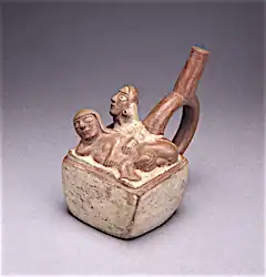 In Japan, records (including detailed shunga) show that some males engaged in penetrative anal intercourse with males.[114] Evidence suggestive of widespread male-female anal intercourse in a pre-modern culture can be found in the erotic vases, or stirrup-spout pots, made by the Moche people of Peru; in a survey, of a collection of these pots, it was found that 31 percent of them depicted male-female anal intercourse significantly more than any other sex act.[115] Moche pottery of this type belonged to the world of the dead, which was believed to be a reversal of life. Therefore, the reverse of common practices was often portrayed. The Larco Museum houses an erotic gallery in which this pottery is showcased.[116]