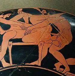 From the earliest records, the ancient Sumerians had very relaxed attitudes toward sex[97] and did not regard anal sex as taboo.[97] Entu priestesses were forbidden from producing offspring[98][99] and frequently engaged in anal sex as a method of birth control.[98][97][99] Anal sex is also obliquely alluded to by a description of an omen in which a man "keeps saying to his wife: 'Bring your backside.'"[99] Other Sumerian texts refer to homosexual anal intercourse.[97] The gala, a set of priests who worked in the temples of the goddess Inanna, where they performed elegies and lamentations, were especially known for their homosexual proclivities.[100] The Sumerian sign for gala was a ligature of the signs for 'penis' and 'anus'.[100] One Sumerian proverb reads: "When the gala wiped off his ass [he said], 'I must not arouse that which belongs to my mistress [i.e., Inanna].'"[100] The term Greek love has long been used to refer to anal intercourse, and in modern times, "doing it the Greek way" is sometimes used as slang for anal sex.[101] Male-male anal sex was not a universally accepted practice in Ancient Greece; it was the target of jokes in some Athenian comedies.[102] Aristophanes, for instance, mockingly alludes to the practice, claiming, "Most citizens are europroktoi ('wide-arsed') now."[103] The terms kinaidos, europroktoi, and katapygon were used by Greek residents to categorize men who chronically[104] practiced passive anal intercourse.[105] Pederastic practices in ancient Greece (sexual activity between men and adolescent boys), at least in Athens and Sparta, were expected to avoid penetrative sex of any kind. Greek artwork of sexual interaction between men and boys usually depicted fondling or intercrural sex, which was not condemned for violating or feminizing boys,[106] while male-male anal intercourse was usually depicted between males of the same age-group.[107] Intercrural sex was not considered penetrative and two males engaging in it was considered a "clean" act.[102] Some sources explicitly state that anal sex between men and boys was criticized as shameful and seen as a form of hubris.[106][108] Evidence suggests that the younger partner in pederastic relationships (i.e., the eromenos) did engage in receptive anal intercourse so long as no one accused him of being 'feminine'.[109]