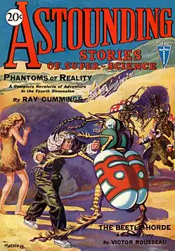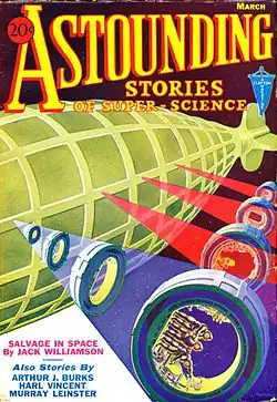Astounding was initially published by Publisher's Fiscal Corporation, a subsidiary of Clayton Magazines.[4][7][8] The first issue appeared in January 1930, with Bates as editor. Bates aimed for straightforward action-adventure stories, with scientific elements only present to provide minimal plausibility.[4] Clayton paid much better rates than Amazing and Wonder Stories—two cents a word on acceptance, rather than half a cent a word, on publication (or sometimes later)—and consequently Astounding attracted some of the better-known pulp writers, such as Murray Leinster, Victor Rousseau, and Jack Williamson.[3][4] In February 1931, the original name Astounding Stories of Super-Science was shortened to Astounding Stories.[9]