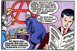Grant laconically described Lonnie Machin as "a serious-beyond-his-years teenager who wants to set the world to rights".[53] As the character was based on a theme of ideas, he had initially been given no personal, tragic past, a common motivator in superhero fiction. This was intended to contrast with Batman, who fought crime due to personal tragedy, while Anarky would do so in the name of ideals and beliefs.[24] As the character was further developed, he was also intended to contrast with common teenage superheroes. Referring to the tradition established by Stan Lee and Jack Kirby of saddling teenagers with personal problems, Grant purposely gave Anarky none, nor did he develop a girlfriend or social life for the character. As Grant wrote for the Batman: Anarky introduction, this was intended to convey the idea that Anarky was single-minded in his goals.[24] In one of the earliest explorations of Lonnie Machin's back story in "The Anarky Ultimatum", Grant described Lonnie as a voracious reader, but also of being isolated from peers his own age during his childhood.[50] This was elaborated upon years later in the "Anarky" storyline, which described Lonnie as having lost a childhood friend living in an impoverished nation, the latter suffering the loss of his family due to civil war and strife before disappearing entirely. The resulting shock of discovering at such a young age that the world was in turmoil precipitated Lonnie Machin's rapid maturation and eventual radicalization.[54]