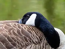 Subfamily: Anatinae, dabbling ducks and moa-nalos (The dabbling duck group, of worldwide distribution, were previously restricted to just one or two genera, but had been extended[10] to include eight extant genera and about 55 living species, including several genera formerly known as the "perching ducks"; mtDNA on the other hand confirms that the genus Anas is over-lumped and casts doubt on the diving duck affiliations of several genera [see below]. The moa-nalos, of which four species in three genera are known to date, are a peculiar group of flightless, extinct anatids from the Hawaiian Islands. Gigantic in size and with massive bills, they were believed to be geese, but have been shown to be actually very closely related to mallards. They evolved filling the ecological niche of turtles, ungulates, and other megaherbivores. A Canada goose tucking its bill under its wing