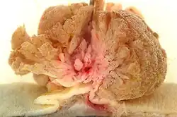 - Gross examination – the examination of diseased tissues with the naked eye. This is important especially for large tissue fragments, because the disease can often be visually identified. It is also at this step that the pathologist selects areas that will be processed for histopathology. The eye can sometimes be aided with a magnifying glass or a stereo microscope, especially when examining parasitic organisms.