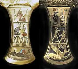 The Naqada culture manufactured a diverse selection of material goods, reflective of the increasing power and wealth of the elite, as well as societal personal-use items, which included combs, small statuary, painted pottery, high quality decorative stone vases, cosmetic palettes, and jewelry made of gold, lapis, and ivory. They also developed a ceramic glaze known as faience, which was used well into the Roman Period to decorate cups, amulets, and figurines.[18][19] During the last predynastic phase, the Naqada culture began using written symbols that eventually were developed into a full system of hieroglyphs for writing the ancient Egyptian language.[20]