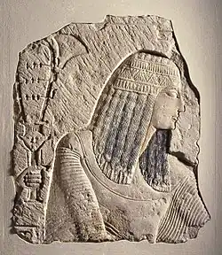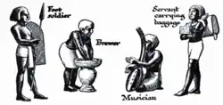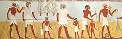 Egyptian society was highly stratified, and social status was expressly displayed. Farmers made up the bulk of the population, but agricultural produce was owned directly by the state, temple, or noble family that owned the land.[80] Farmers were also subject to a labor tax and were required to work on irrigation or construction projects in a corvée system.[81] Artists and craftsmen were of higher status than farmers, but they were also under state control, working in the shops attached to the temples and paid directly from the state treasury. Scribes and officials formed the upper class in ancient Egypt, known as the "white kilt class" in reference to the bleached linen garments that served as a mark of their rank.[82] The upper class prominently displayed their social status in art and literature. Below the nobility were the priests, physicians, and engineers with specialized training in their field. It is unclear whether slavery as understood today existed in ancient Egypt; there is difference of opinions among authors.[83]