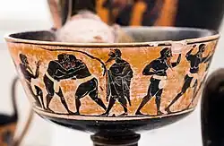 Areas around the Mediterranean had a long tradition of physical activities, even though they did not seem to hold regular competitions, with the events being probably the preserve of kings and upper classes.[17] The earliest evidence of athletic tradition in Greece come from late Bronze Age artistic representations, such as from the island of Crete and Thera, and Archaic literary texts.[18] The Minoan culture centered on Crete engaged in gymnastics, with bull-leaping, tumbling, running, wrestling and boxing shown on their frescoes. The Mycenaeans adopted Minoan games and also raced chariots in religious or funerary ceremonies.[19][20] The exact relation between the early Minoan and Mycenaean sporting activities and the later Greek practicies remains elusive.[21] The heroes of Homer's epics, composed around 750 BC and held to represent a late Bronze Age society, participate in athletic competitions to honor the dead. In the Iliad there are chariot races, boxing, wrestling, a foot race, as well as fencing, archery, and spear throwing. The Odyssey adds to these a long jump and discus throw.[22][23]