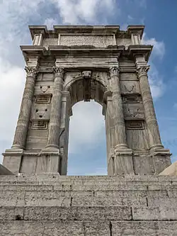 Its harbour was of considerable importance in imperial times, as the nearest to Dalmatia, and was enlarged by Trajan, who constructed the north quay with his architect Apollodorus of Damascus. At the beginning of it stands the marble triumphal arch, the Arch of Trajan with a single archway, and without bas-reliefs, erected in his honour in 115 by the Senate and Roman people.,[14] to honor the emperor who had made "the entrance to Italy safer" (tutiorem accessum Italiae), as can be read in the inscription on the arch.