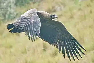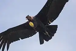 The adult plumage is all black, except for a frill of white feathers at the base of the neck and, especially in the male, large white bands on the wings, which only appear after the bird's first moult.[28] The head and neck, kept meticulously clean, are red to blackish-red, and have few feathers.[29] Their baldness means the skin is more exposed to the sterilizing effects of dehydration and high-altitude UV light.[30] The crown of the head is flattened, and (in the male) is topped by a dark red comb (also called a caruncle); the skin hanging from its neck is called a wattle.[28] Males also have yellower skin. When condors are agitated (for example, during courtship), their head and neck flush, a clear signal to animals nearby. This flush of colour is especially intense in dominant males when feeding at carcasses, and can happen in just a few seconds.[31] Juveniles are grayish-brown, but with a blackish head and neck, and a brown ruff.[15]