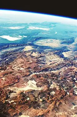 The Andean orogen has a series of bends or oroclines. The Bolivian Orocline is a seaward-concave bending in the coast of South America and the Andes Mountains at about 18° S.[9][10] At this point, the orientation of the Andes turns from northwest in Peru to south in Chile and Argentina.[10] The Andean segments north and south of the Orocline have been rotated 15° counter-clockwise to 20° clockwise respectively.[10][11] The Bolivian Orocline area overlaps with the area of the maximum width of the Altiplano Plateau, and according to Isacks (1988) the Orocline is related to crustal shortening.[9] The specific point at 18° S where the coastline bends is known as the Arica Elbow.[12] Further south lies the Maipo Orocline, a more subtle orocline between 30° S and 38°S with a seaward-concave break in the trend at 33° S.[13] Near the southern tip of the Andes lies the Patagonian Orocline.[14]