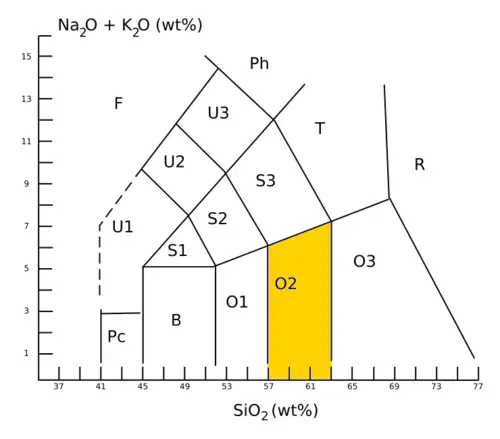 Andesite is an aphanitic (fine-grained) to porphyritic (coarse-grained) igneous rock that is intermediate in its content of silica and low in alkali metals. It has less than 20% quartz and 10% feldspathoid by volume, with at least 65% of the feldspar in the rock consisting of plagioclase. This places andesite in the basalt/andesite field of the QAPF diagram. Andesite is further distinguished from basalt by its silica content of over 52%.[5][6][7][8] However, it is often not possible to determine the mineral composition of volcanic rocks, due to their very fine grain size, and andesite is then defined chemically as volcanic rock with a content of 57% to 63% silica and not more than about 6% alkali metal oxides. This places the andesite in the O2 field of the TAS classification. Basaltic andesite, with a content of 52% to 57% silica, is represented by the O1 field of the TAS classification but is not a distinct rock type in the QAPF classification.[8]