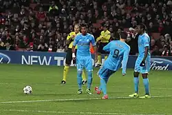 Gignac scored in each of Marseille's three opening matches of the league season, all victories, with the third being the 84th-minute only goal of an away win at Valenciennes on 24 August.[65] In January 2014, he scored braces in consecutive rounds of the Coupe de France: an extra-time double to dispatch Reims in the round of 64 on 5 January, and a further two in a 4–5 home defeat to Nice 16 days later. On 4 May, he scored twice in a 4–2 win over Lyon,[66] finishing the season with 16 league goals, joint-second with four other players behind PSG's Zlatan Ibrahimović.