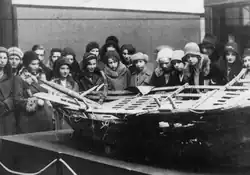 In search of water, two of the sealers, Olav Salen and Karl Tusvick, discovered Andrée's boat near a small stream, frozen under a mound of snow and full of equipment, including a boathook engraved with the words "Andrée's Polar Expedition, 1896".[39] Presented with this hook, Bratvaag's captain, Peder Eliassen, assigned the crew to search the site together with the expedition members. Among other finds, they uncovered a journal and two skeletons, identified as Andrée's and Strindberg's remains by monograms found on their clothing.[39]